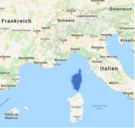 Wir überqueren mit dem Bus die Alpen und nehmen von Savona aus die Nachtfähre nach Bastia, einem charmanten Hafenstädtchen im Nordosten von Korsika. Während sich die Fähre am nächsten Morgen langsam der Insel nährt, taucht Korsika mit seinen 2000 Meter hohen Gipfeln wie ein „Gebirge im Mittelmeer“ vor uns auf.