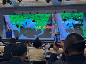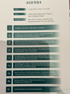 Die Moderation übernahm Herr Hui Zahoxu, Direktor des Handelsamts der Provinz Sichuan. Neben den Grußworten von Herrn Wang Xiaohui, Parteisekretär und Vorsitzender des Ständigen Ausschusses des Volkskongresses der Provinz Sichuan und von Herrn Staatsminister Dr. Florian Hermann, Leiter der Bayerischen Staatskanzlei und Staatsminister für Bundesangelegenheiten und Medien sowie von Herrn QIU Xuejun, Generalkonsul der Volksrepublik China in München durften wir eindrucksvollen Vorstellungen der Provinz Sichuan als Wirtschafts- und Handelsstandort (Herr Hui Zahoxu, Direktor des Handelsamtes der Provinz Sichuan) sowie der Kultur- und Tourismusbranche der Provinz Sichuan (Chen Guanghao, Direktor des Amtes für Kultur und Tourismus der Provinz Sichuan) beiwohnen. Auch der gezeigte Imagefilm war mehr aus beeindruckend, und Erinnerungen von unserer Delegationsreise im Juni 2025 wurden wach. Danach folgten Reden von Herrn Winfried Bostelmann, Chairman of ESMEA (European Small and Medium sized Enterprises´ Association sowie von Herrn Uwe Michel, Executive Vice President der Allianz SE.